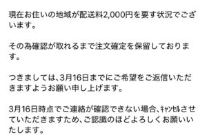 「現在お住いの地域が配送料2,000円を要す状況でございます」 「確認が取れるまで注文確定を保留しております」